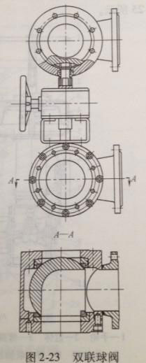 該種球閥的機構如圖2-23所示,為雙聯L形浮動(dòng)三通(tōng)球閥。該種球閥用一(yī)個手柄或蝸輪蝸杆手動裝置操縱兩個L形三通球閥兩(liǎng)個動作必須完全同步,使一(yī)個出(chū)於開啟狀態,另一(yī)個則出於(yú)關閉狀態。閥座密封圈采用聚四氟(fú)乙烯(PTFE)製造用螺栓壓緊閥蓋,實現密封。閥(fá)體與閥(fá)蓋連接處(chù)設有調整墊片,以調整預緊力,閥座底部設有蝶形彈簧,齒輪(lún)箱(xiāng)與一球閥用支架固(gù)定連接,與另一個球閥(fá)用活動接頭連接,要保證兩個球閥閥杆同軸,兩個球閥閥杆連接方(fāng)向成180°。