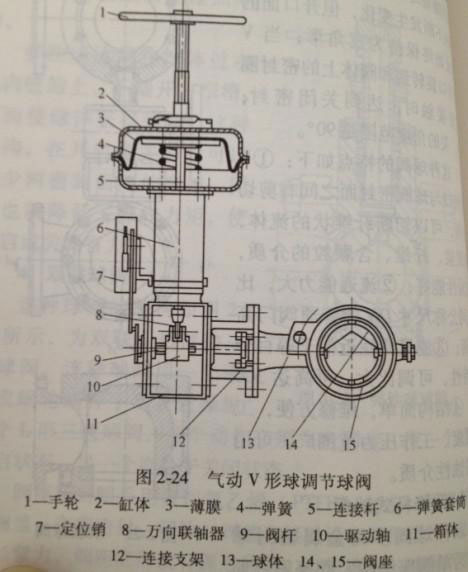 其機(jī)構如圖2-24所示。它在球體上(shàng)開有一個V形通(tōng)道(dào)口,隨著球體(tǐ)的旋轉,開口的(de)麵(miàn)積不斷發生變化,但開口(kǒu)麵的形狀始終保持為三(sān)角形;當V形開口旋轉到和閥體上的密封圈緊密接觸時,達到關閉密封;開(kāi)、關的角(jiǎo)度範(fàn)圍是(shì)90°。