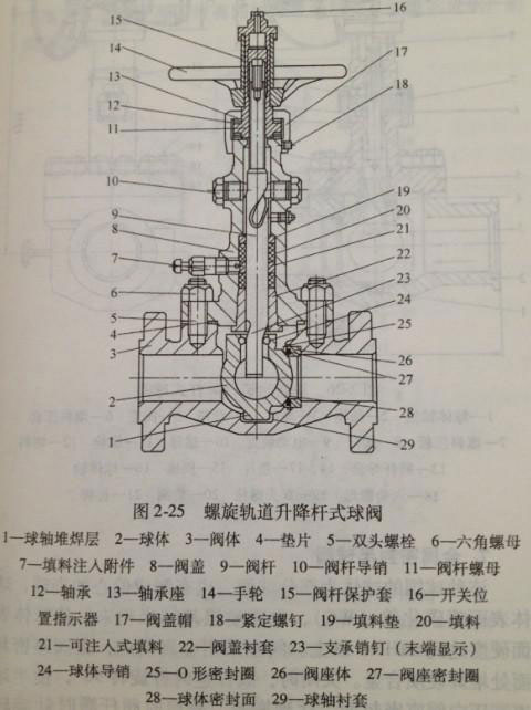 另(lìng)一種機構是(shì)在閥杆的下(xià)部銑有螺旋扁,當閥杆升降時,螺旋扁先帶動球(qiú)體脫落閥座密封麵,然(rán)後在旋轉90°開啟。當關閉時,閥(fá)杆帶動球體旋轉90°,達到關閉位置後,再壓(yā)向閥座密封麵(miàn),如圖2-26所示。這種球(qiú)閥(fá)在啟閉過程中,沒有摩擦,適用於高溫、高壓、介質帶有懸浮顆粒、強腐蝕工(gōng)況。