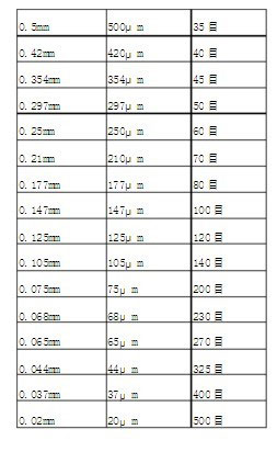 在(zài)礦山機械行業,特(tè)別是磨粉設備裏經(jīng)常出現粉體的成(chéng)品(pǐn)可達到多少目數,比如說我們(men)生產(chǎn)的Y型過濾器高可達到(dào)2000目,其實(shí)很多人腦子裏(lǐ)沒有(yǒu)目數這個概念,不知(zhī)道什麽是目,但是目確(què)實是一個在礦山機械裏(lǐ)麵經常出現的一個詞(cí)匯,那麽(me)在(zài)這(zhè)裏重工(gōng)機械網就告訴大(dà)家,什麽(me)是目(mù)數,它是怎麽一個粒度單(dān)位?目和毫米之間的轉化關係,一目等於多少(shǎo)毫米,或者是一毫米等於(yú)多少目,看了下麵的(de)毫米(mǐ)和目的換算關係您將對目不再茫然:毫米和目的換算關係目數(shù)是(shì)雷蒙磨粉機(jī)操作(zuò)及工業磨粉行業的常用單位名詞,依據中華人民共和國標準GB3520-83,它和毫米和微米的換算關係如下(xià):