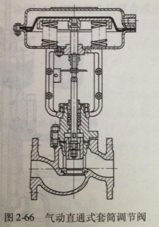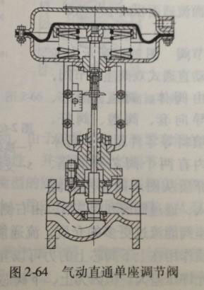 1.直(zhí)通單座閥  2-64所示為常用的(de)氣動直通單座調節閥。它由閥體、閥座、閥芯、導向套、閥蓋、閥杆和填(tián)料等零件(jiàn)組成。閥芯和閥杆連接在一起,連接(jiē)方法(fǎ)可用過盈配合銷釘固定或螺紋連接銷釘固(gù)定(dìng),也可以閥(fá)芯和閥杆製成一體,在閥蓋和(hé)閥體間設有導向套,為閥芯上下移動起導向作用。導向套上的(de)小孔,連通閥體內腔和閥的出口(kǒu)端,導向套上腔的介質很容易(yì)通過小孔流入閥的出口(kǒu)端,不會影響閥芯移動。