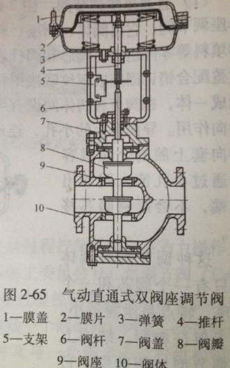 2.直通式雙座調節閥  圖2-25所示為氣動直通式雙(shuāng)閥座調節閥,由閥體、閥座、閥芯、閥杆、閥蓋、導向套、填料等零件組成,閥體內有兩個閥芯(xīn)和閥座、介質從圖示閥體左側流入,通過閥座和閥芯後,有右側流出,它比同公稱尺寸的單座閥能流過更多的介質,流通力(lì)約提高20%~50%,介質作用在(zài)上下閥芯上的力可以互(hù)相抵消,所以不平衡力小,允許壓力大。但因為上、下閥芯不(bú)容易保證同時密(mì)封,所(suǒ)以泄漏量大;另外,閥門的介質(zhì)流路較為複雜(zá),在高壓差中使(shǐ)用時,對閥體的衝刷及汽蝕損壞較(jiào)嚴重;不適(shì)用高粘度介質和含纖維介質的調節。
