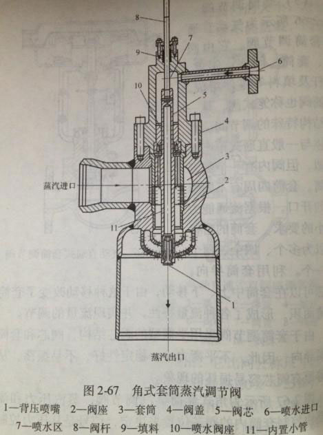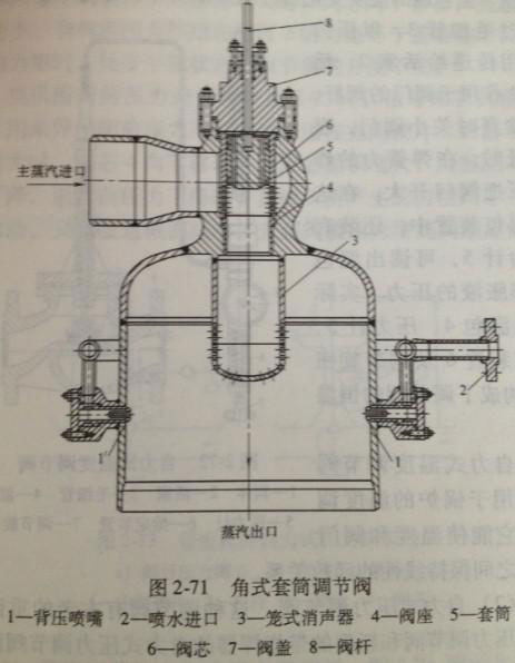 圖2-67所示為角式套筒蒸汽調節閥,蒸汽(qì)壓力和流量都是由控製套(tào)筒內的閥(fá)芯位置來決定(dìng),信號是從壓力控製回路到閥門執行器,是平衡閥閥(fá)芯行程增大(dà)或(huò)減小,從而增大或減小流通麵積。控製套筒有一排可達到所需流量特性的節液孔,以向下的方向流向出口。調節閥的出口端設有降低噪聲的多孔罩,通過小孔,可降低噪聲。
