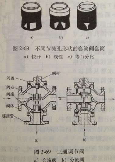 4.三通調節閥  圖2-69所示為三(sān)通調節閥。它由閥體(tǐ)、閥座、閥芯、閥杆、閥(fá)蓋及填料等零件組成,閥體(tǐ)上有三個通道與管相連,按其作用方式,三通調節閥可分為分(fèn)流型(把一種介質分成兩路)、合流形(把兩路(lù)介(jiè)質混合成一路)。