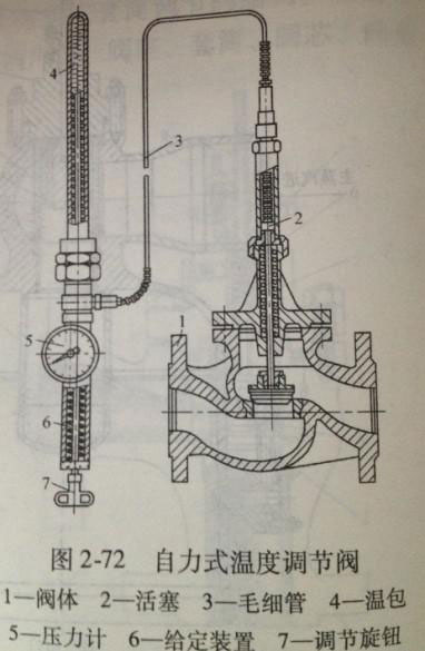 (1)自力式溫度調節閥  自力式溫度調節閥的(de)機構如圖2-72所示。隻要把溫包插入到要調溫的管路中,就可以感受到溫度的變化,控製閥門的開(kāi)度。因為溫包中填充有定量的膨脹液體(tǐ),液(yè)體的體積又(yòu)和溫度有關,可以成為調節閥的感溫元件。利用給定(dìng)裝置6和調節旋(xuán)鈕7可改變(biàn)填充有膨脹液的溫包4的容積,是調節閥設定在一個適當(dāng)的規定溫度值。溫包內的溫度變化(huà)後,液體體積有了變化(huà),這一(yī)變化通過毛細管(guǎn)3,一壓力作用傳遞(dì)給活塞2,活塞2作用於閥(fá)門(mén)的閥杆,溫度高時關小閥門,溫度(dù)低時,在彈簧力的作用下把閥(fá)門(mén)開大。在這種溫包裝置中,還裝有壓力計5,可讀出溫包(bāo)中膨脹液的壓力。實際上,溫包4,、壓力計5、給定裝置6及調節旋鈕7,構成了調節(jiē)閥的恒(héng)溫器。