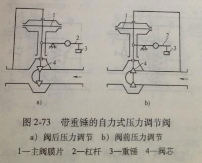 1.重錘自力式壓力調節閥。這是一種簡單的調節方法,根據作用方式可分為閥(fá)前壓力調節和閥後壓力調節兩種,如圖2-73所示。