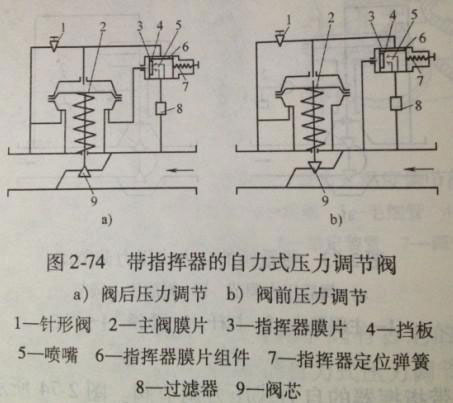2.帶指揮器的自(zì)力式壓(yā)力調節閥。圖2-74所示為(wéi)帶指揮(huī)器的自力式調節閥,采用圖2-74a所(suǒ)示的閥後壓力調節時,當被調介質(zhì)的壓力升高(gāo),作(zuò)用在主閥膜片上(shàng)2下麵的壓力就大於(yú)上麵(miàn)的壓力,閥芯9向上移動,使流通(tōng)麵積減小,這樣,閥後壓稍微(wēi)下降,同時作用在指揮器膜片上3上的(de)壓力增大,當作用在指揮器膜片3上的力(lì)大於指揮器給定彈簧7的力時,指揮膜片組件6向右移動,擋(dǎng)板4靠近噴(pēn)嘴5,指揮器(qì)的輸出壓力減小,通到(dào)主閥膜片2上麵的壓力隨(suí)之降低,閥芯9繼續向上移動,流通麵積繼續減小,被(bèi)調(diào)介質的壓力繼續降(jiàng)低(dī),直到與指揮器給定彈簧7的(de)力(lì)時,指揮器膜(mó)片組件6向左移動,擋板4離(lí)開噴嘴,指(zhǐ)揮器的輸(shū)出壓力增大,將閥芯9打開,閥後壓(yā)力回升到給定值,針型閥1用做(zuò)調(diào)整放大倍數,過濾器8能夠去介質中的顆粒雜質,防止噴嘴被堵而失去作用。