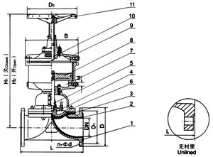 部件列表: 1、閥體 2、閥體襯裏 3、隔膜 4、閥瓣 5、下閥杆 6、閥蓋 7、氣缸 8、活塞 9、氣缸蓋 10、上(shàng)閥杆(gǎn) 11、手輪
