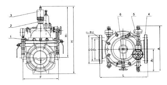 1、球閥2、導閥3、流量調節閥4、主(zhǔ)閥5、壓力表6、針閥