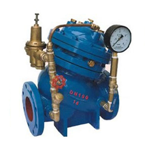 當管道從進水端給水時,水流過針閥進入主(zhǔ)閥控製室,出口壓力通過導管作用到導閥上,當出口壓力高於(yú)導閥設定值時,導閥關閉,控製室停止排水(shuǐ),此時主閥控製室內壓力升高並關(guān)閉主閥,出(chū)口壓力不再升高。