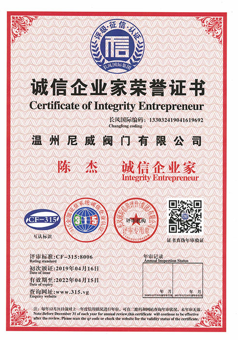 • 誠(chéng)信企(qǐ)業家榮譽證書